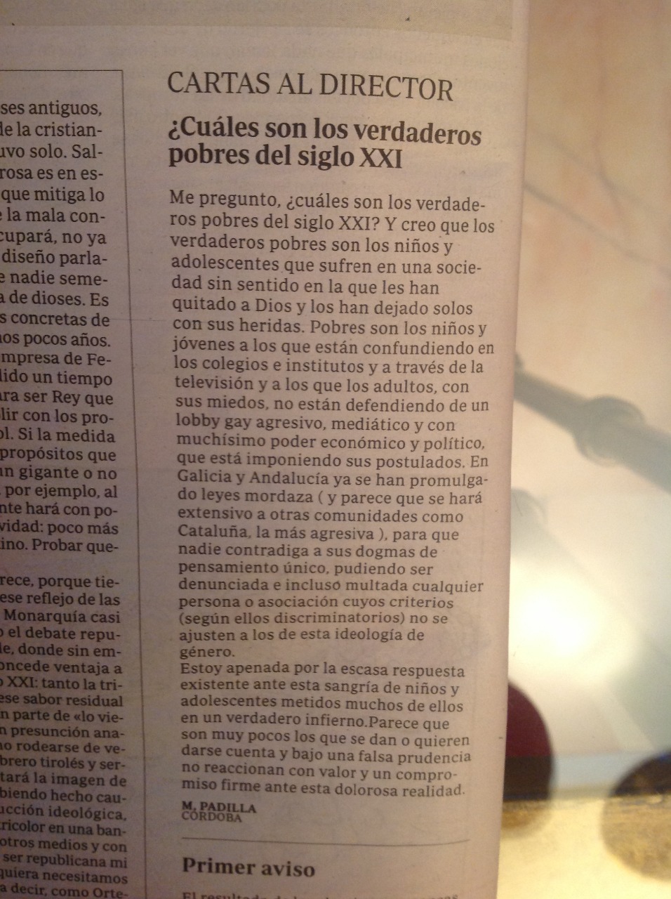 Me pregunto: ¿cuáles son los verdaderos pobres del siglo XXI? Y creo que los verdaderos pobres son los niños y adolescentes que sufren en una sociedad sin sentido en la que les han quitado a Dios y los han dejado solos con sus heridas. Pobres son los niños y jóvenes a los que están confundiendo en los colegios e institutos y a través de la televisión y a los que los adultos, con sus miedos, no están defendiendo de un lobby gay agresivo, mediático y con muchísimo poder económico y político, que está imponiendo sus postulados. En Galicia y Andalucía ya se han promulgado leyes mordaza ( y parece que se hará extensivo a otras comunidades Cataluña la más agresiva), para que nadie contradiga a sus DOGMAS DE PENSAMIENTO ÚNICO, pudiendo ser denunciada e incluso multada cualquier persona o asociación cuyos criterios (según ellos discriminatorios) no se ajusten a los de esta ideología de género.